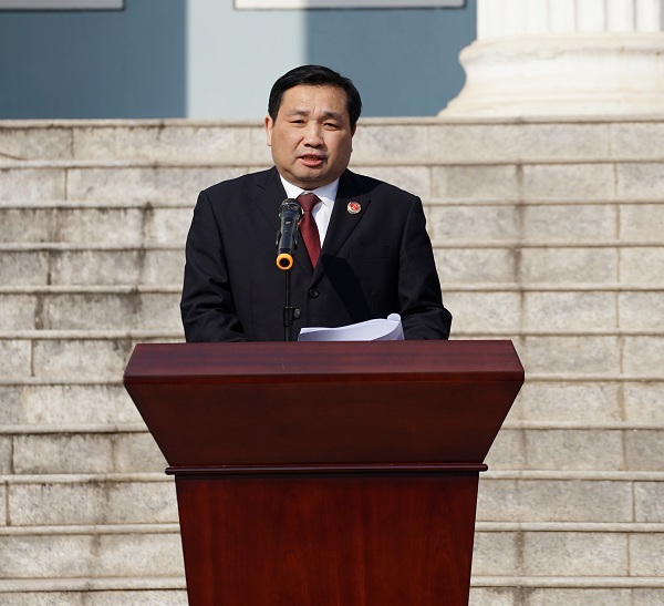 嘉鱼县检察院党组书记、检察长陈德东在仪式上做表态发言,他表示嘉鱼县检察院将不负领导重托,在县委和上级院的领导下全力服务嘉鱼经济社会发展;将不忘监督初心,全面履行各项检察职能,通过办案保障、服务和促进发展,确保圆满完成各项目标任务;将不改奋勇争先本色,全力争创“全国模范检察院”。